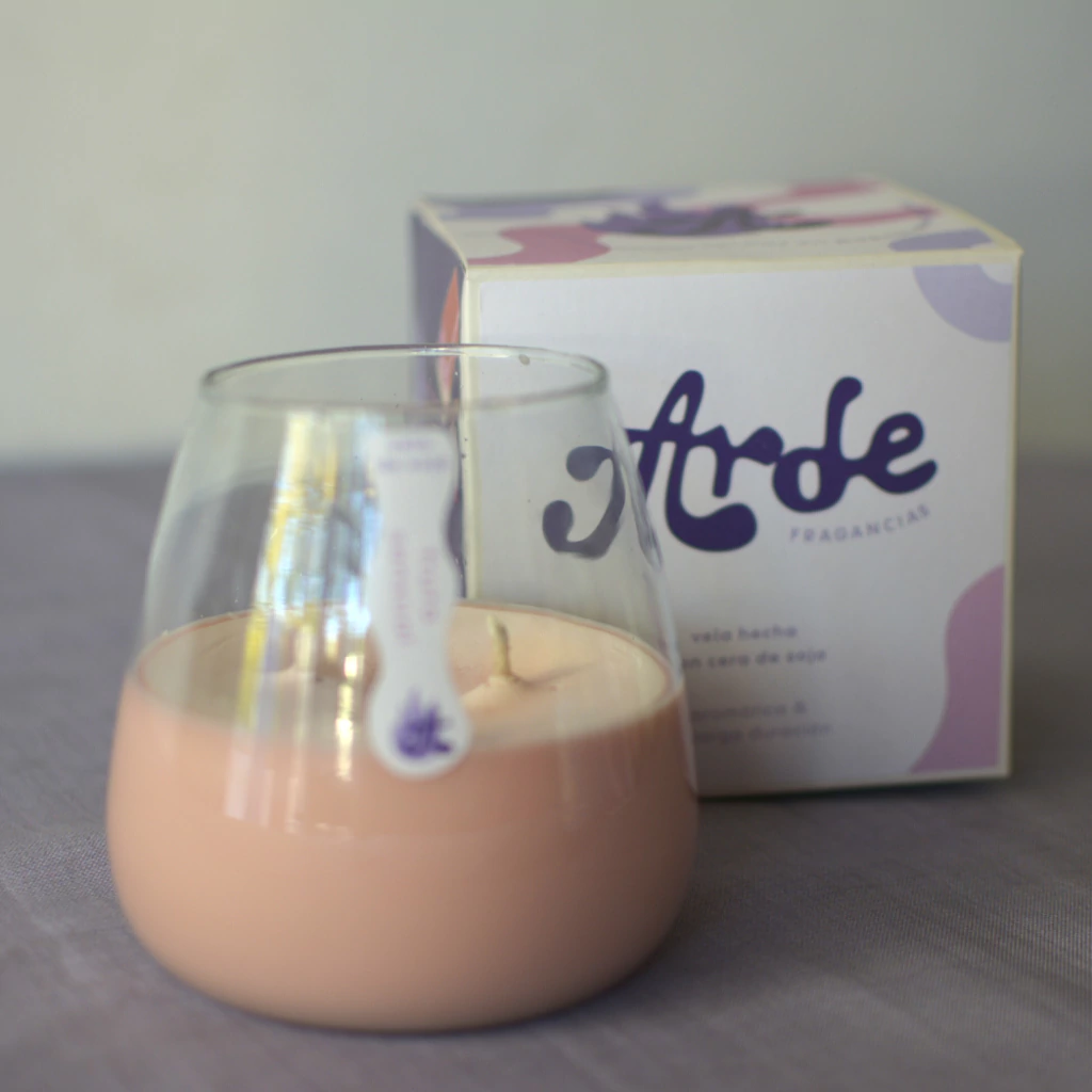Vela aromática de cera de soja. Fabricada de manera artesanal con materias primas de calidad premium. Recipiente: Vaso de vidrio redondeado tipo bombé alto. Contenido: 400 grs. Medidas: alto 12 cm, ancho 12 cm. Cera de colores aleatorios según la fragancia. Incluye caja de cartulina.